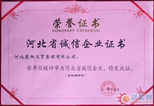 在河北省企業家協會等部門聯合開展的“河北省誠信企業”評選活動中,河北晨陽工貿集團有限公司被評為2015年“河北省誠信企業”,董事長劉善江榮獲“河北省企業誠信建設優秀工作者”稱號。