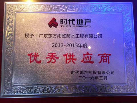 2016年3月25日下午,2016-2018年時代地產戰略合作大會在時代國際單位二期隆重召開,廣東東方雨虹作為時代地產戰略合作伙伴應邀出席此次大會,并榮獲時代地產集團“2013-2015年度優秀供應商”稱號。