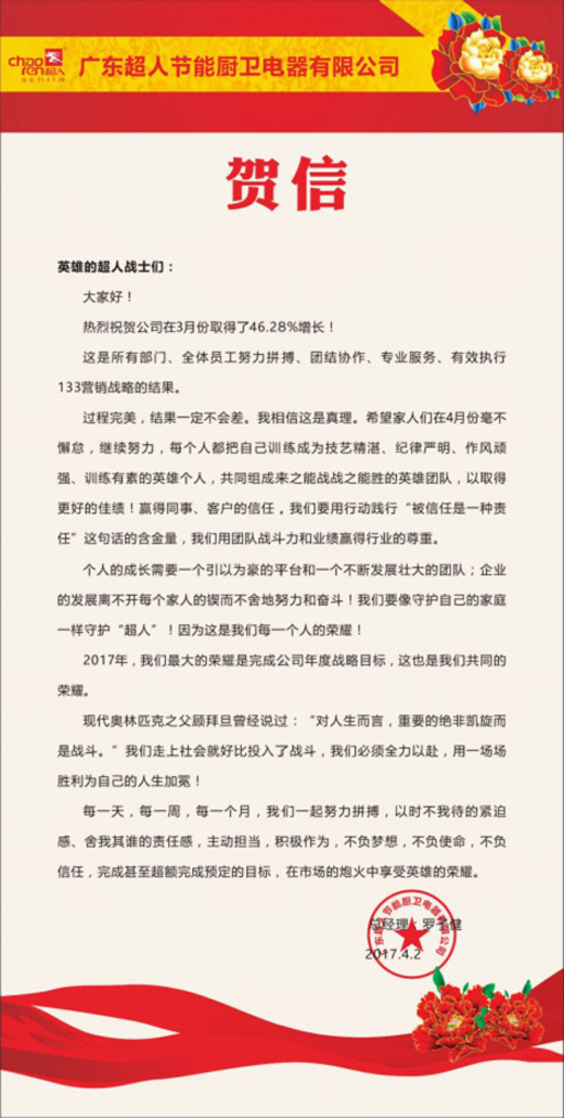 羅子健董事長特發來賀信一封。同時他也寄語全體超人,希望每個月都能寫一封賀信。