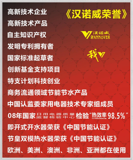 《漢諾威電器》是以高新技術(shù)生產(chǎn)系列化開水器與熱水器的高新技術(shù)企業(yè)。榮獲多份中國(guó)節(jié)能認(rèn)證,榮獲商務(wù)流通領(lǐng)域推薦節(jié)能產(chǎn)品,榮獲多項(xiàng)高新技術(shù)產(chǎn)品證書,是眾多國(guó)家標(biāo)準(zhǔn)起草者,眾多發(fā)明專利和實(shí)用新型專利擁有者。
