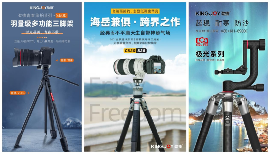 在T216展位上,KINGJOY勁捷攝影器材展示了包括獵影系列、海岳系列、青春旅拍系列、飛燕系列、極光系列以及美顏補光直播支架系列等在內的多款新品。這些產品不僅在設計上充滿創意,更在實用性和功能上賦予了攝影師們全新的拍攝體驗。