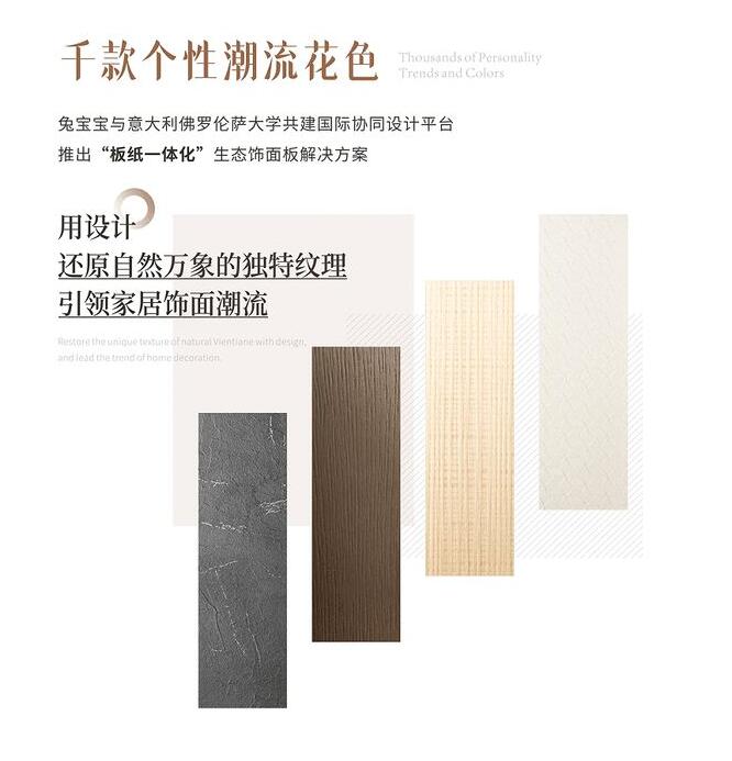 在這個充滿活力與競爭的時代,兔寶寶將再次憑借對市場敏銳的洞察與不懈的追求,成功推出了全新產品——彩臻板。其不僅在飾面創新上取得全新突破,更在環保性能、耐用性和實用性上達到了新的高度,其中所選的原材料均符合國家環保標準,確保家居環境的健康和安全。