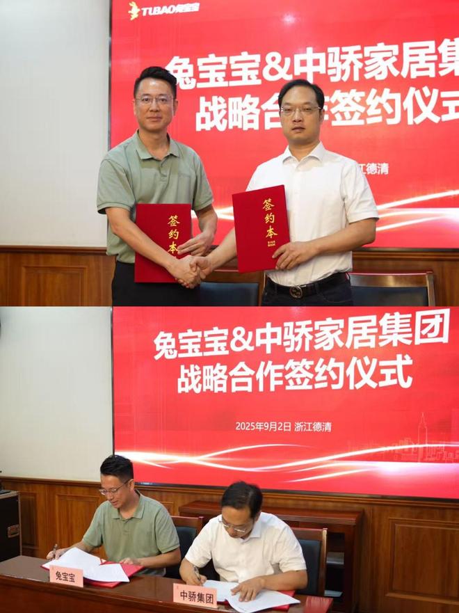 9月2日,兔寶寶與中驕集團戰略合作簽約儀式在兔寶寶武康總部圓滿落幕。此次簽約以 “兔寶寶健康板材定制 + 合作” 為核心,標志著家居行業兩大實力企業正式攜手,將通過優勢互補,為全國消費者打造 “健康環保 + 精工品質” 的一站式家裝解決方案。