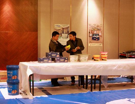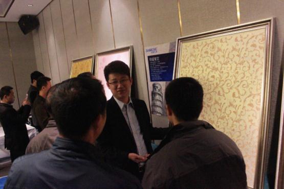 客戶對新產品興趣濃厚,圖為巴德士漆推廣部經理陳少豪在會后為客戶講解巴德士藝術涂料。