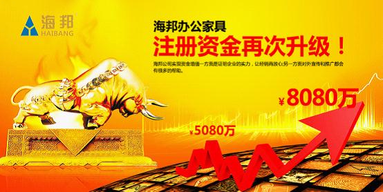 眾所周知,一家有實(shí)力的企業(yè),外在注冊(cè)資金的多少,內(nèi)在產(chǎn)品的質(zhì)量,決定企業(yè)未來的發(fā)展方面。作為中國著名辦公家具品牌海邦原來的注冊(cè)資金就有5080萬元,在行業(yè)中已屬于佼佼者。當(dāng)下,注冊(cè)資金又升級(jí)到8080萬元,如此大手筆的操作,更是令其他同行“望塵莫及”、敬而生畏。