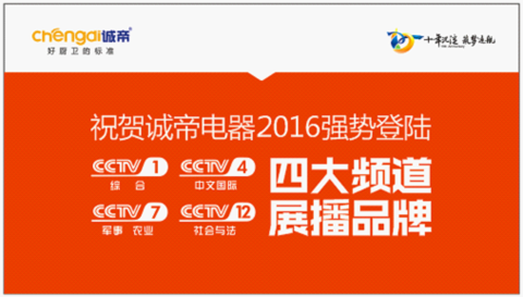 中國馳名的廚衛電器品牌誠帝從發展到壯大,一路上在廚衛電器生產銷售方面取得喜人成績,打下了扎實的基礎。在近期更是憑借自身過硬的實力獲得了“中國廚衛電器著名品牌”稱號。據相關消息報道,近日誠帝電器斥巨資登陸央視四大頻道:CCTV1、CCTV4、CCTV7以及CCTV12,與廣大消費者共同見證誠帝電器品牌實力。