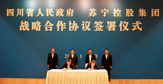 1月11日,四川省省委書記王東明等黨政領(lǐng)導(dǎo)在成都會見了蘇寧控股集團董事長張近東一行,雙方就四川省與蘇寧在未來的戰(zhàn)略合作進行了深度溝通,并簽訂戰(zhàn)略合作框架協(xié)議。今后雙方將在產(chǎn)業(yè)投資、農(nóng)村電商、精準扶貧、實體轉(zhuǎn)型、功能性金融、跨境電商、體育產(chǎn)業(yè)等領(lǐng)域開展戰(zhàn)略合作。