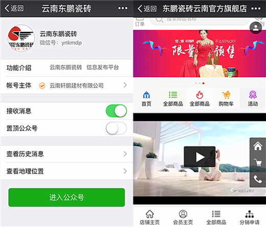 用戶關注“云南東鵬瓷磚”微信公眾號之后,即可直接進入東鵬瓷磚微商城,并成為商城會員,享有諸多會員特權。微商城針對不同的會員的等級會有不同的優惠政策,更好等級的會員還可享受折上折。東鵬瓷磚微商城的營銷功能還遠遠不止這些,團購、眾籌、優惠券、幸運大轉盤等都是經過實踐驗證的有效營銷方式。