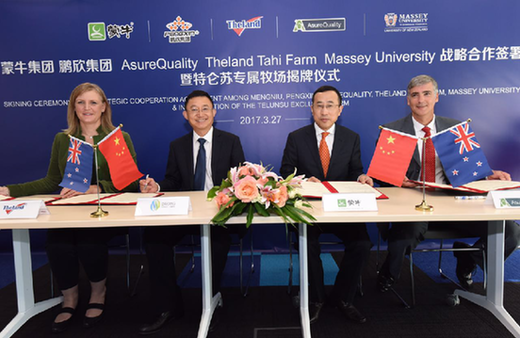 蒙牛攜手鵬欣集團,與新西蘭AsureQuality(安碩)集團及Theland Tahi Farm聯合簽署特侖蘇新西蘭專屬牧場合作項目四方協議