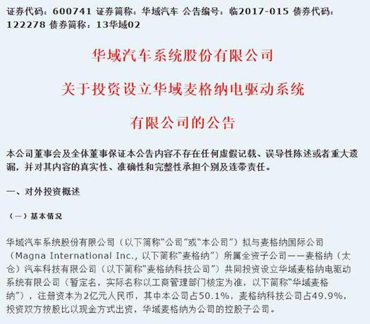 10月18日晚間,上汽集團(tuán)旗下的華域汽車(600741)發(fā)布公告稱,擬與麥格納國際公司所屬全資子公司——麥格納(太倉)汽車科技有限公司(下稱“麥格納科技公司”),共同投資設(shè)立華域麥格納電驅(qū)動(dòng)系統(tǒng)有限公司(暫定名,下稱“華域麥格納”)。