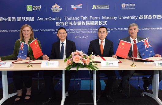 蒙牛率先開展海外全產業鏈布局,與鵬欣集團、新西蘭安碩集團及塔西牧場等簽署四方協議